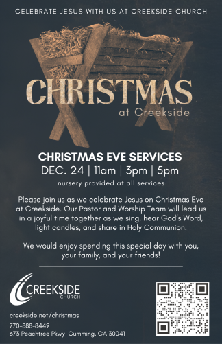 Please join us as we celebrate Jesus on Christmas Eve at Creekside. Our Pastor and Worship Team will lead us in a joyful time together as we sing, hear God's Word, light candles, and share in Holy Communion. We would enjoy spending this special day with you and/or your family! We have three services at different times on Christmas Eve. Join us for our 11 am service, where there will be an Impromptu Caroling Choir and guest accompanist Judy Boehm playing piano. If you have any interest in being a part of the Caroling Choir, we hope you will participate! You can also join us at 3 or 5 pm for a joyful celebration with our full band!
