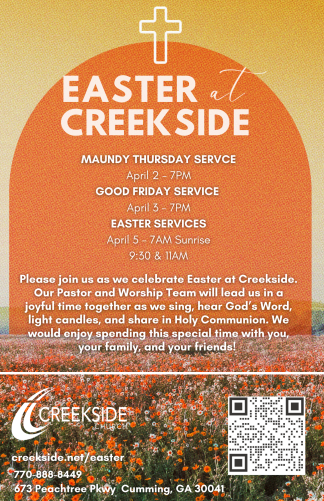 This service will be at 7am and held outside in the front parking lot near the three crosses and is led by the Creekside Church Student Ministry. If the weather is bad, we will move it indoors (Worship Center). There will be live music and a message from Pastor Jason. We will celebrate Communion as the sun rises. Nursery is not available at this service time.