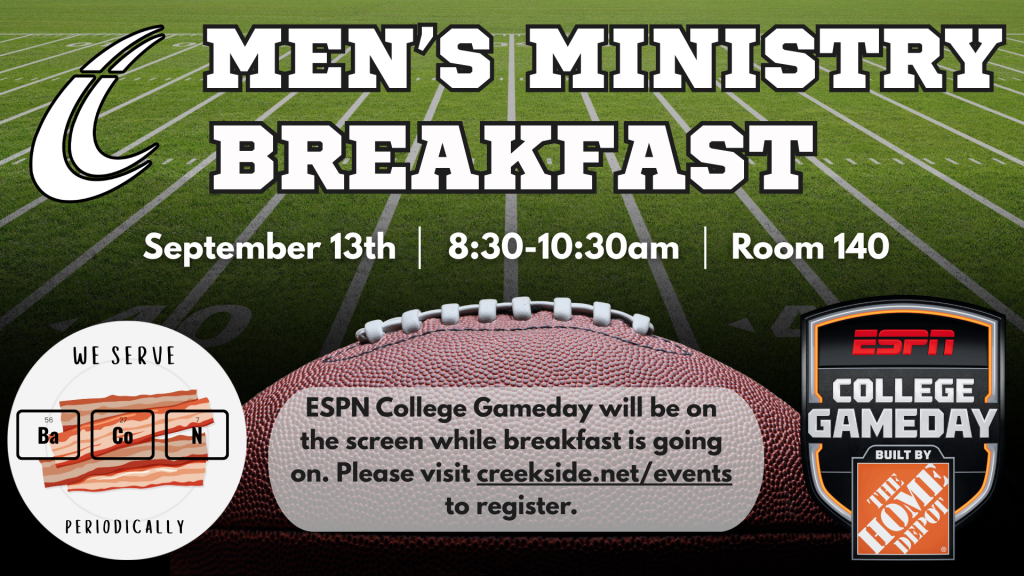 Please join us for breakfast at our Creekside Men's breakfast on Saturday, September 13th! This is a great opportunity for meeting with other men, being encouraged and challenged through God's word, and enjoying a meal together. Who do you know that needs to get connected with some men seeking after God? You are encouraged to invite them to come with you to breakfast and experience fellowship with other men who want to become more like Christ. Your invitation just might be the catalyst they need in their spiritual journey.