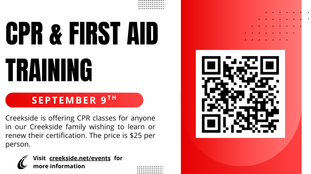 Creekside is excited to offer a CPR and First Aid certification course designed for everyone in our church family—whether you need it for work, volunteering, or simply want to be prepared to care for loved ones. This comprehensive training covers adult, child, and infant CPR, as well as basic first aid, and meets certification requirements established by Bright from the Start, NAEYC, DHR, and DSS.
