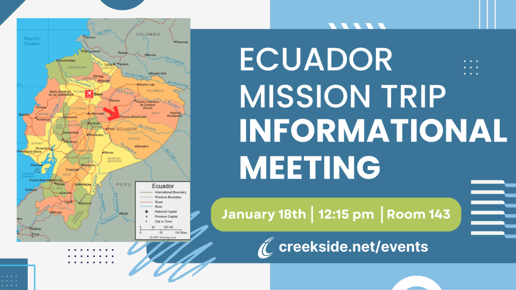 Creekside is planning a mission trip to Ecuador on July 18 through July 24, 2026. If you are interested in learning more about the Ecuador mission trip, an informational meeting will be held on January 18, at 12:15pm in room 143.