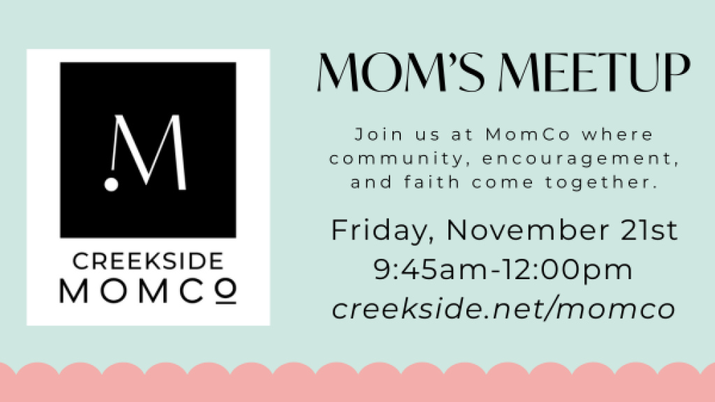 The MomCo at Creekside meets from 9:45 am until 12:00 pm, typically on two Fridays per month during the school year. Each meeting provides an inviting environment where women can come "just as they are” to build friendships, be encouraged, and gain practical strategies all while any young children are lovingly cared for in our KidCo program (drop-off starts at 9:30 am). A typical meeting starts by sharing breakfast together. There is usually a craft project or speaker on a motherhood topic. Discussion groups allow moms personal time with a smaller group of moms to share ideas, thoughts, and experiences. Also, in attendance at each meeting are seasoned moms there to encourage, mentor, and give practical advice based on their experience and wisdom. We close with prayer requests and door prizes.